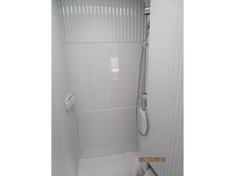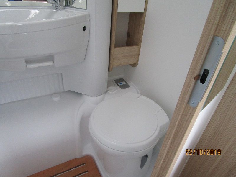 De camper heeft een ruime badkamer met wastafel en toilet en kastruimte. Om te douchen moet de achterwand 90 graden gedraaid worden, dit gaat in een seconde. Hoewel dit systeem al zo’n 20 jaren in dit type camper wordt gebruikt blijven mensen dit zeer handig en praktisch vinden. Omdat toilet en douche in dezelfde ruimte zijn verwerkt houd je dus meer ruimte over voor de andere benodigdheden.