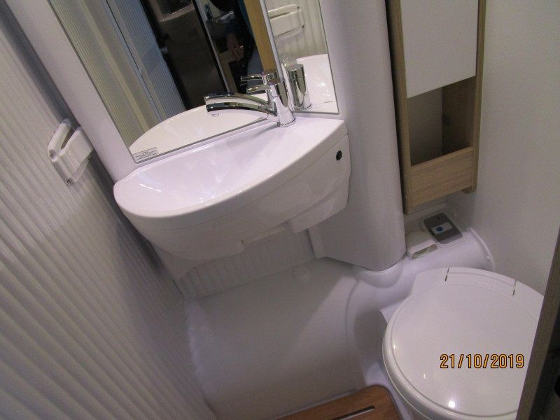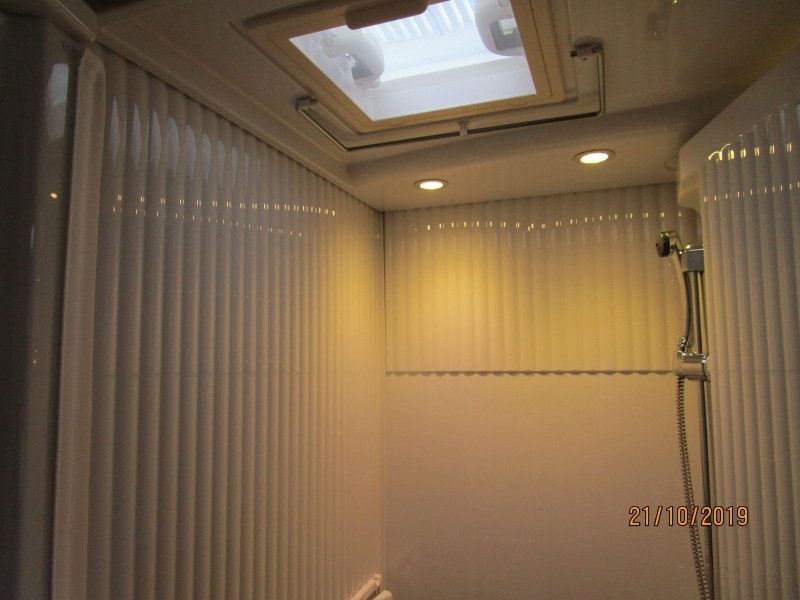 De camper heeft een ruime badkamer met wastafel en toilet en kastruimte. Om te douchen moet de achterwand 90 graden gedraaid worden, dit gaat in een seconde. Hoewel dit systeem al zo’n 20 jaren in dit type camper wordt gebruikt blijven mensen dit zeer handig en praktisch vinden. Omdat toilet en douche in dezelfde ruimte zijn verwerkt houd je dus meer ruimte over voor de andere benodigdheden.