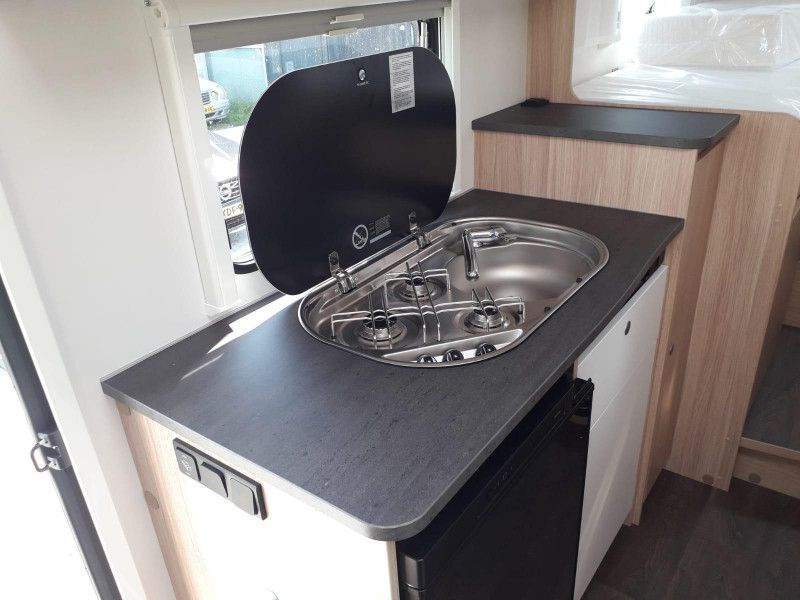Deze camper heeft een tafelmodel koelkast die onder het aanrechtblad is weggewerkt. Het vriesvak is in de koelkast aanwezig. De koelkast werkt tijdens het rijden op de startaccu, wanneer je op een camping of camperplaats over 230V beschikt gebruikt de koelkast 230V en wanneer je geparkeerd staat werkt de koelkast op gas. Uiteraard moet je in het laatste geval zorgen dat je de gasfles opengedraaid hebt.