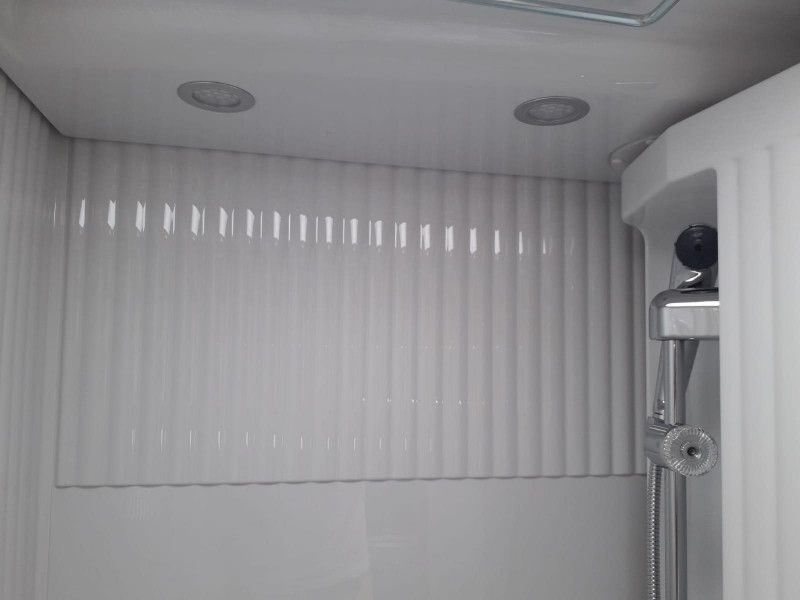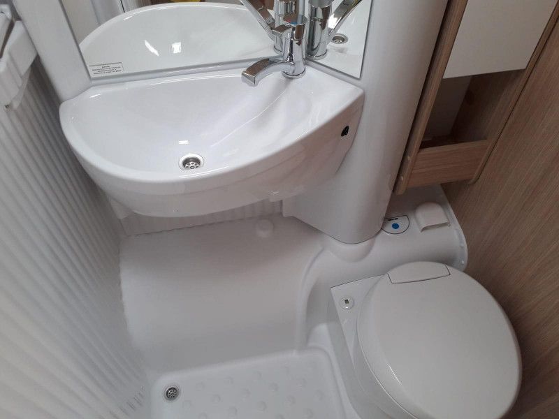 De camper heeft een ruime badkamer met wastafel en toilet en kastruimte. Om te douchen moet de achterwand 90 graden gedraaid worden, dit gaat in een seconde. Hoewel dit systeem al zo’n 20 jaren in dit type camper wordt gebruikt blijven mensen dit zeer handig en praktisch vinden. Omdat toilet en douche in dezelfde ruimte zijn verwerkt houd je dus meer ruimte over voor de andere benodigdheden.