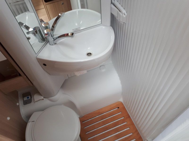De camper heeft een ruime badkamer met wastafel en toilet en kastruimte. Om te douchen moet de achterwand 90 graden gedraaid worden, dit gaat in een seconde. Hoewel dit systeem al zo’n 20 jaren in dit type camper wordt gebruikt blijven mensen dit zeer handig en praktisch vinden. Omdat toilet en douche in dezelfde ruimte zijn verwerkt houd je dus meer ruimte over voor de andere benodigdheden.