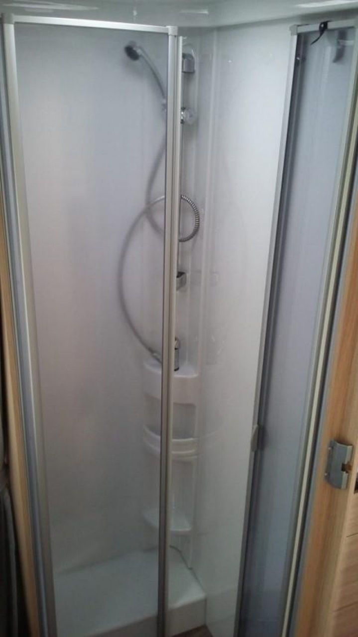De douche is recht tegenover het badkamertje gesitueerd en dus apart.