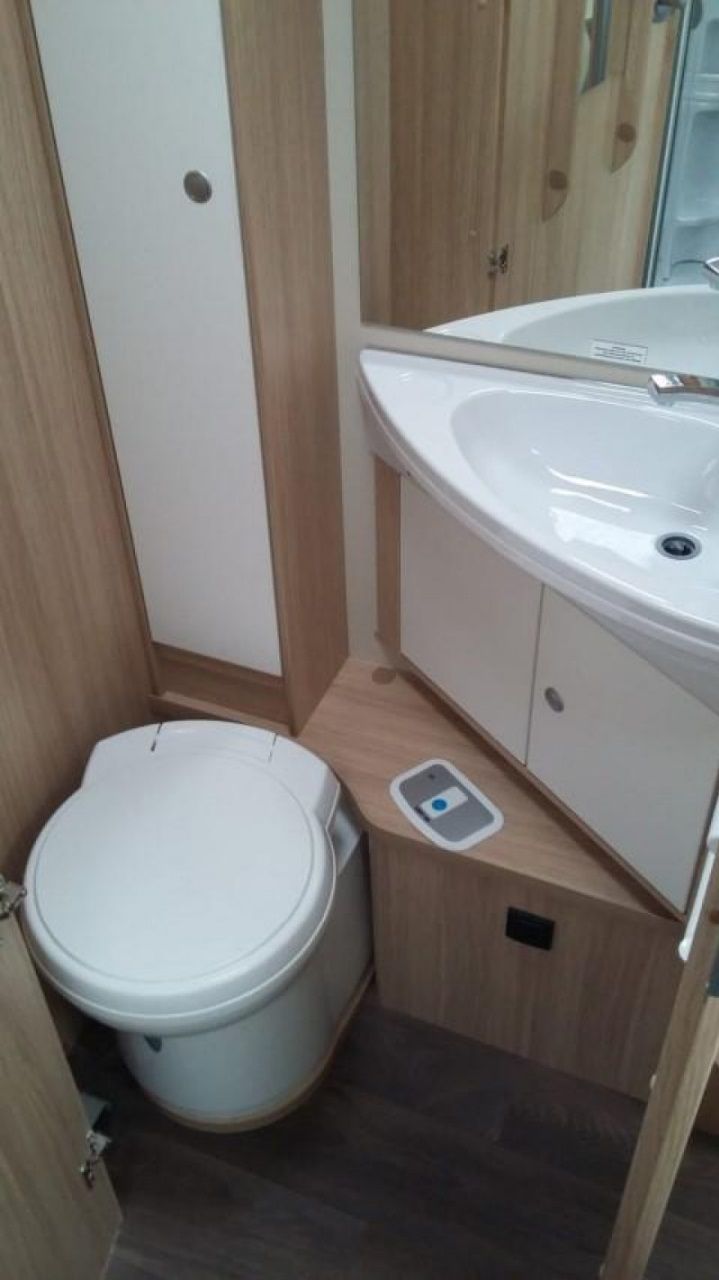 De camper heeft een ruime badkamer met wastafel en toilet en kastruimte.