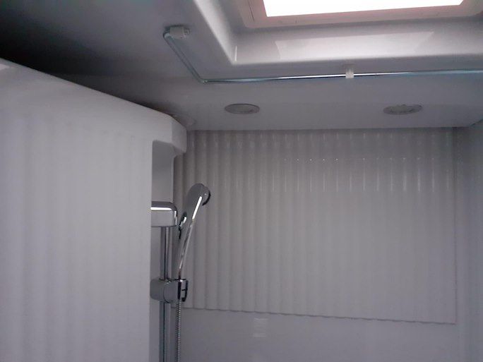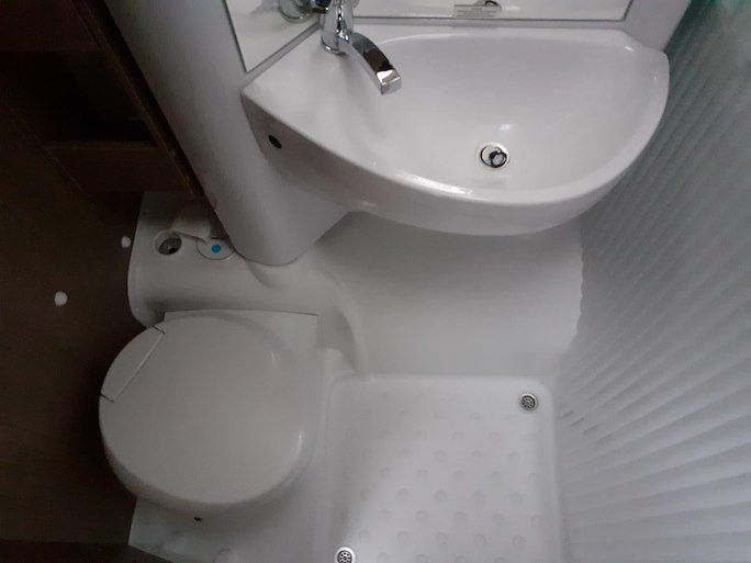 De camper heeft een ruime badkamer met wastafel en toilet en kastruimte. Om te douchen moet de achterwand 90 graden gedraaid worden, dit gaat in een seconde. Hoewel dit systeem al zo’n 20 jaren in dit type camper wordt gebruikt blijven mensen dit zeer handig en praktisch vinden. Omdat toilet en douche in dezelfde ruimte zijn verwerkt houd je dus meer ruimte over voor de andere benodigdheden.