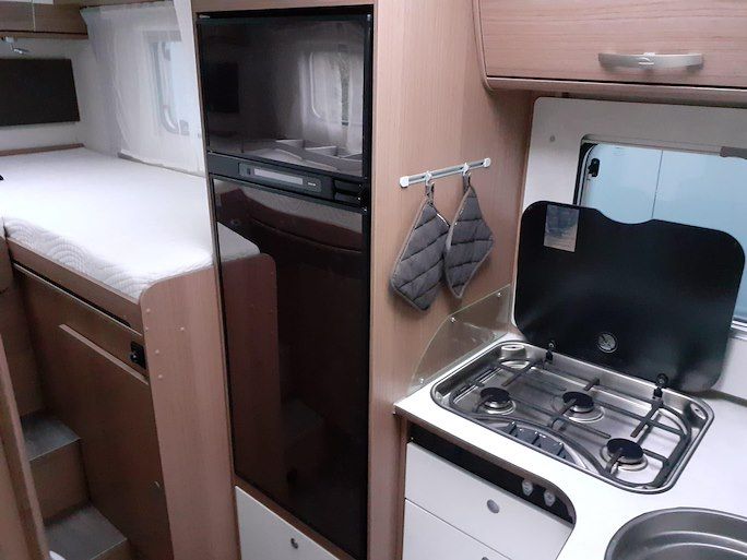 Deze camper heeft een zeer grote koelkast met een aparte deur voor het vriesvak. De koelkast werkt tijdens het rijden op de startaccu, wanneer je op een camping of camperplaats over 230V beschikt gebruikt de koelkast 230V en wanneer je geparkeerd staat werkt de koelkast op gas. Uiteraard moet je in het laatste geval zorgen dat je de gasfles opengedraaid hebt.